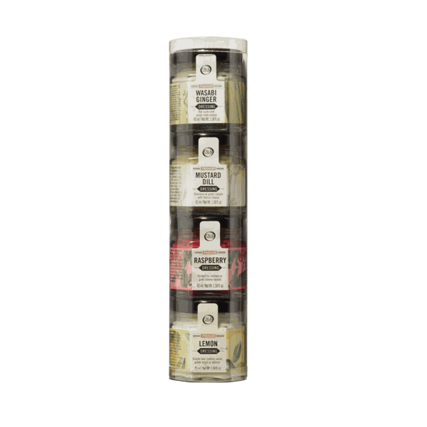 This set features four of our most-loved ready-made dressings: Wasabi Ginger, Mustard Dill, Raspberry, and Lemon. Their convenient mini size makes them perfect for gifting—or for sampling all the flavors yourself.